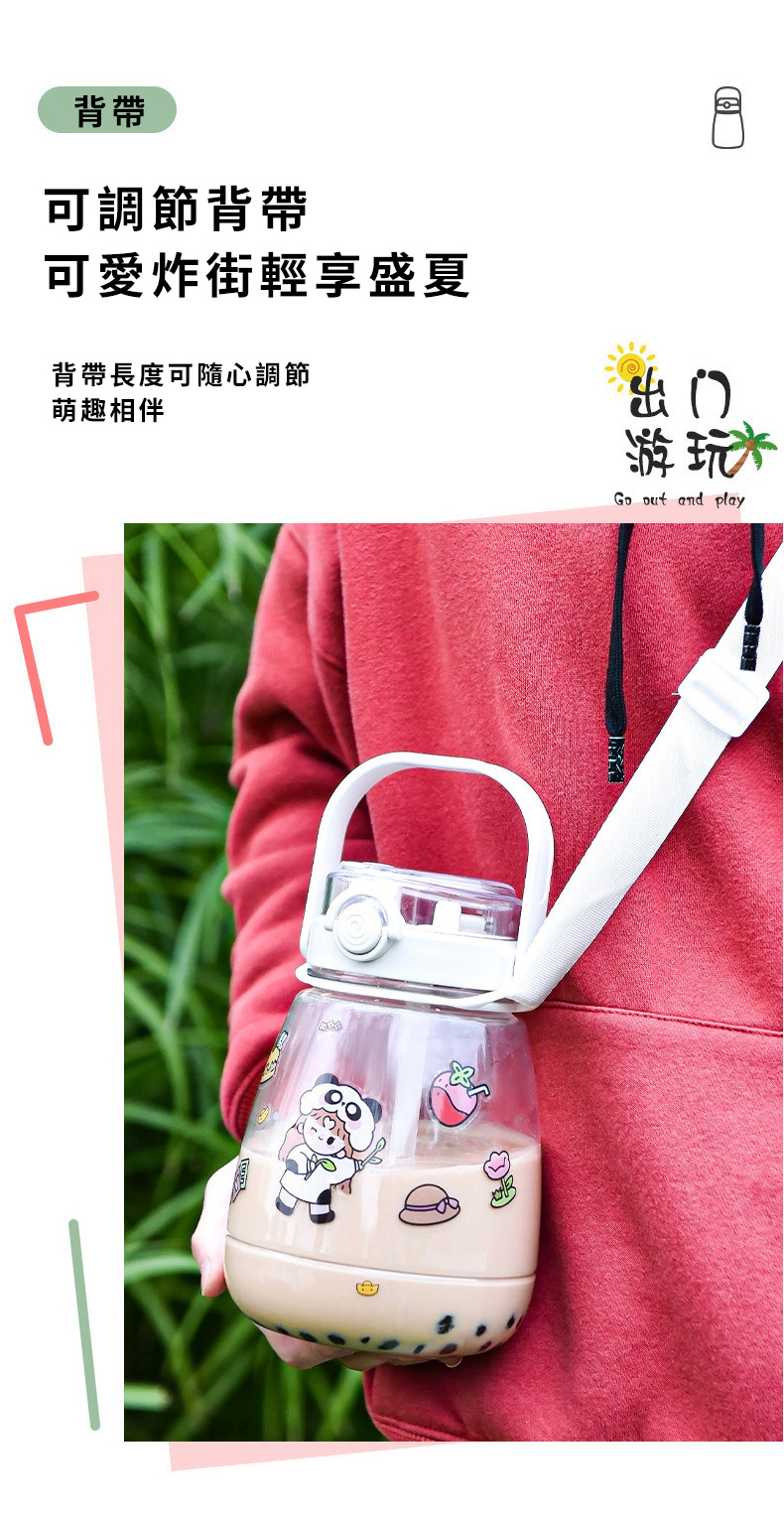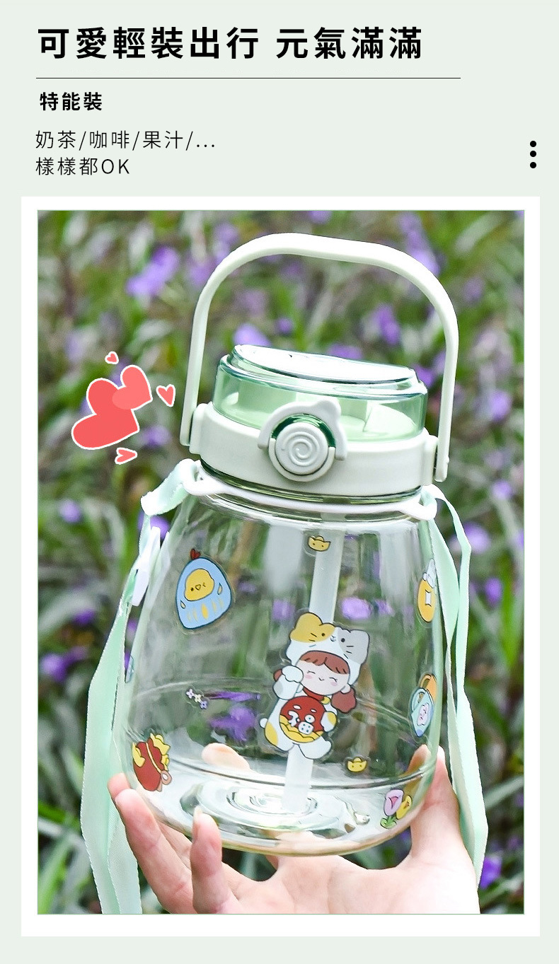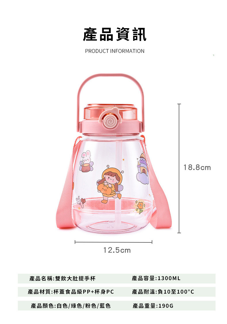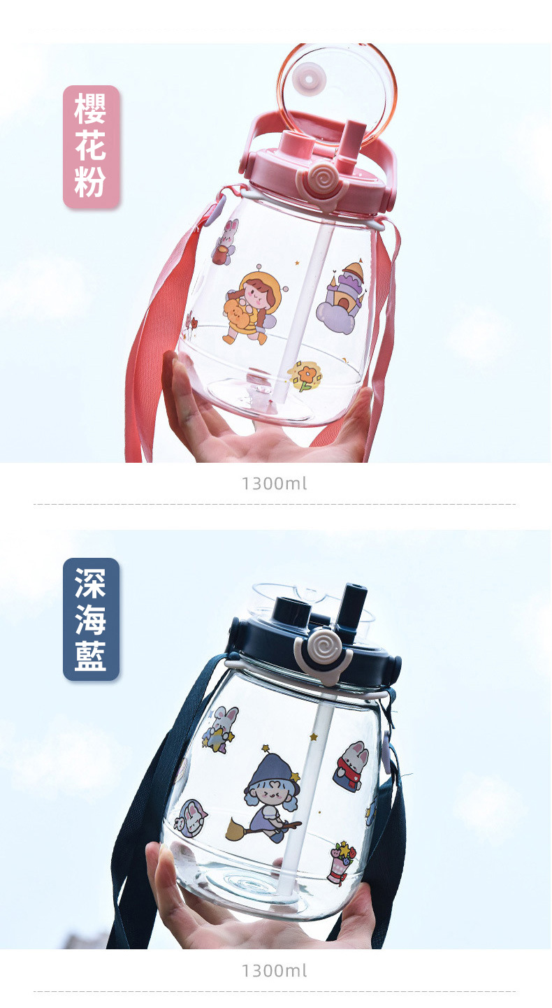 網紅大肚杯水壺採用三種飲用方式設計,健身水杯、戶外太空杯、帶吸管水瓶推薦1300ml大容量,滿足出行所需,大肚杯水壺便攜提手+背帶設計,攜帶不勞累,尼龍背帶長短可隨心調節,提手加寬設計,滿載也不勒手,矽膠密封圈,放置滴水不漏。
