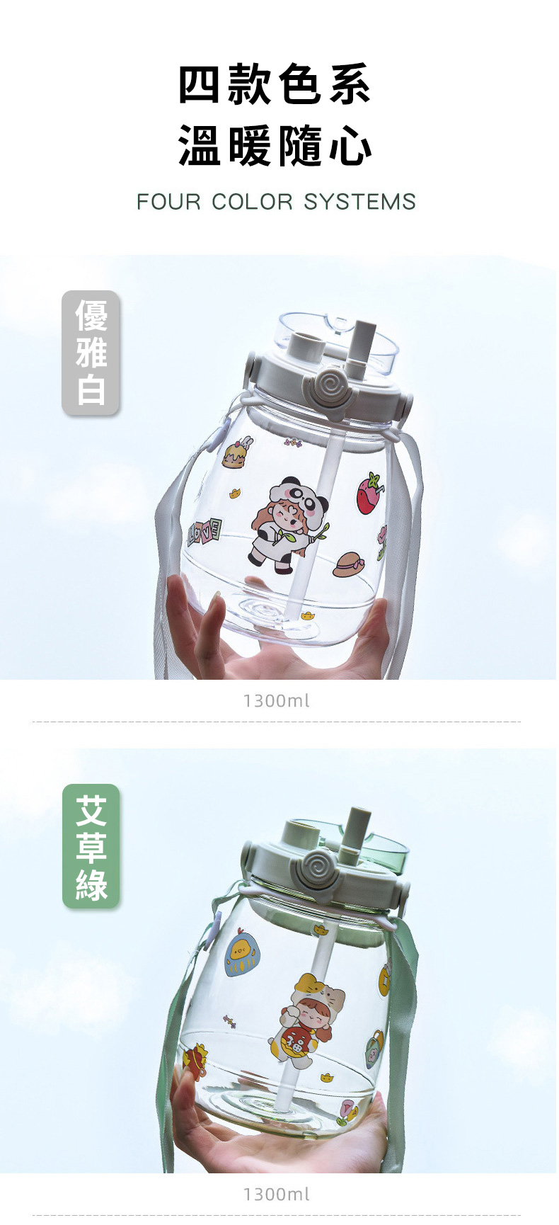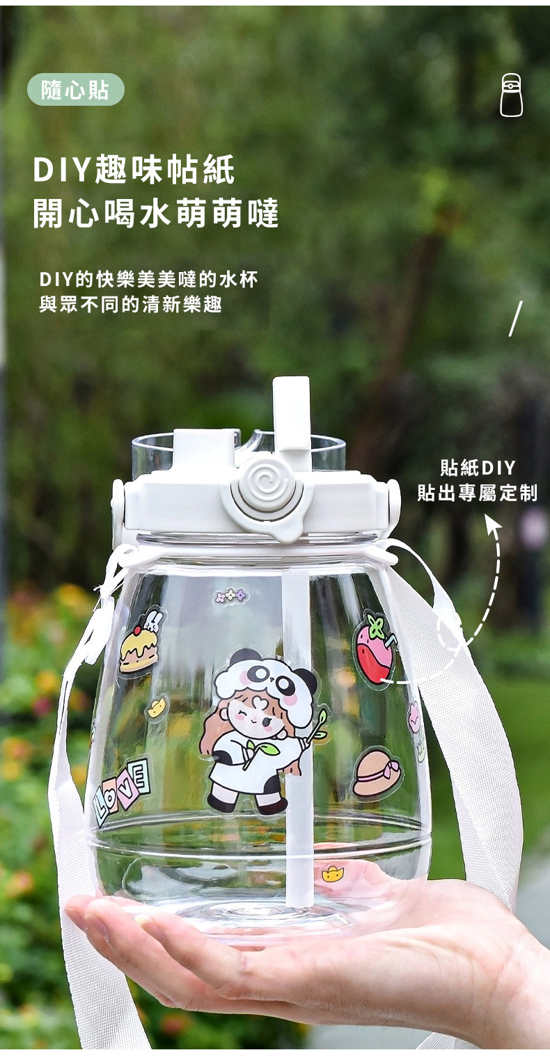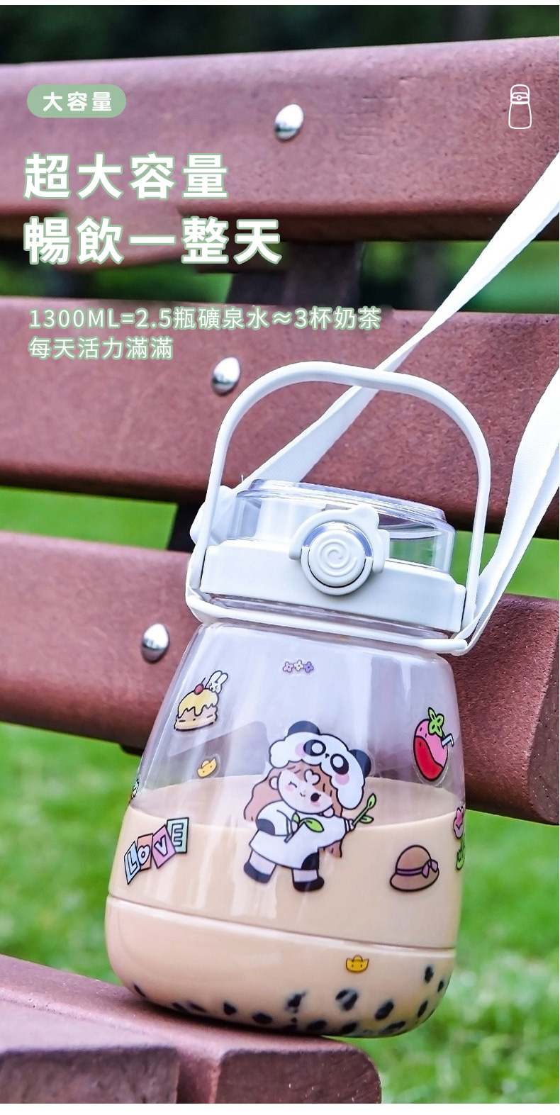網紅大肚杯水壺採用三種飲用方式設計,健身水杯、戶外太空杯、帶吸管水瓶推薦1300ml大容量,滿足出行所需,大肚杯水壺便攜提手+背帶設計,攜帶不勞累,尼龍背帶長短可隨心調節,提手加寬設計,滿載也不勒手,矽膠密封圈,放置滴水不漏。